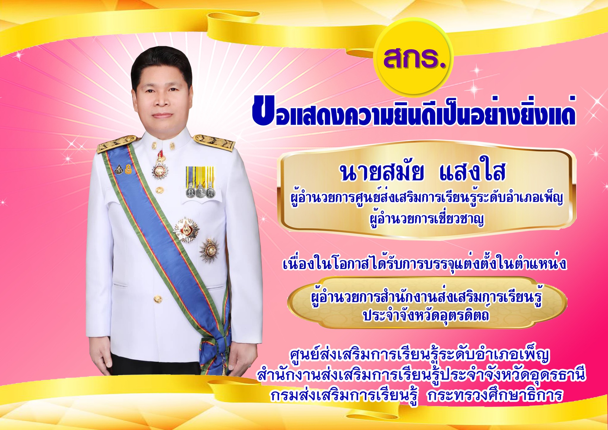 ขอแสดงความยินดีเป็นอย่างยิ่งแด่ นายสมัย แสงใส ผู้อำนวยการศูนย์ส่งเสริมการเรียนรู้ระดับอำเภอเพ็ญ ผู้อำนวยการเชี่ยวชาญ เนื่องในโอกาสได้รับการบรรจุแต่งตั้งในตำแหน่ง ผู้อำนวยการสำนักงานส่งเสริมการเรียนรู้ ประจำจังหวัดอุตรดิตถ์ กรมส่งเสริมการเรียนรู้ กระทรวงศึกษาธิการ